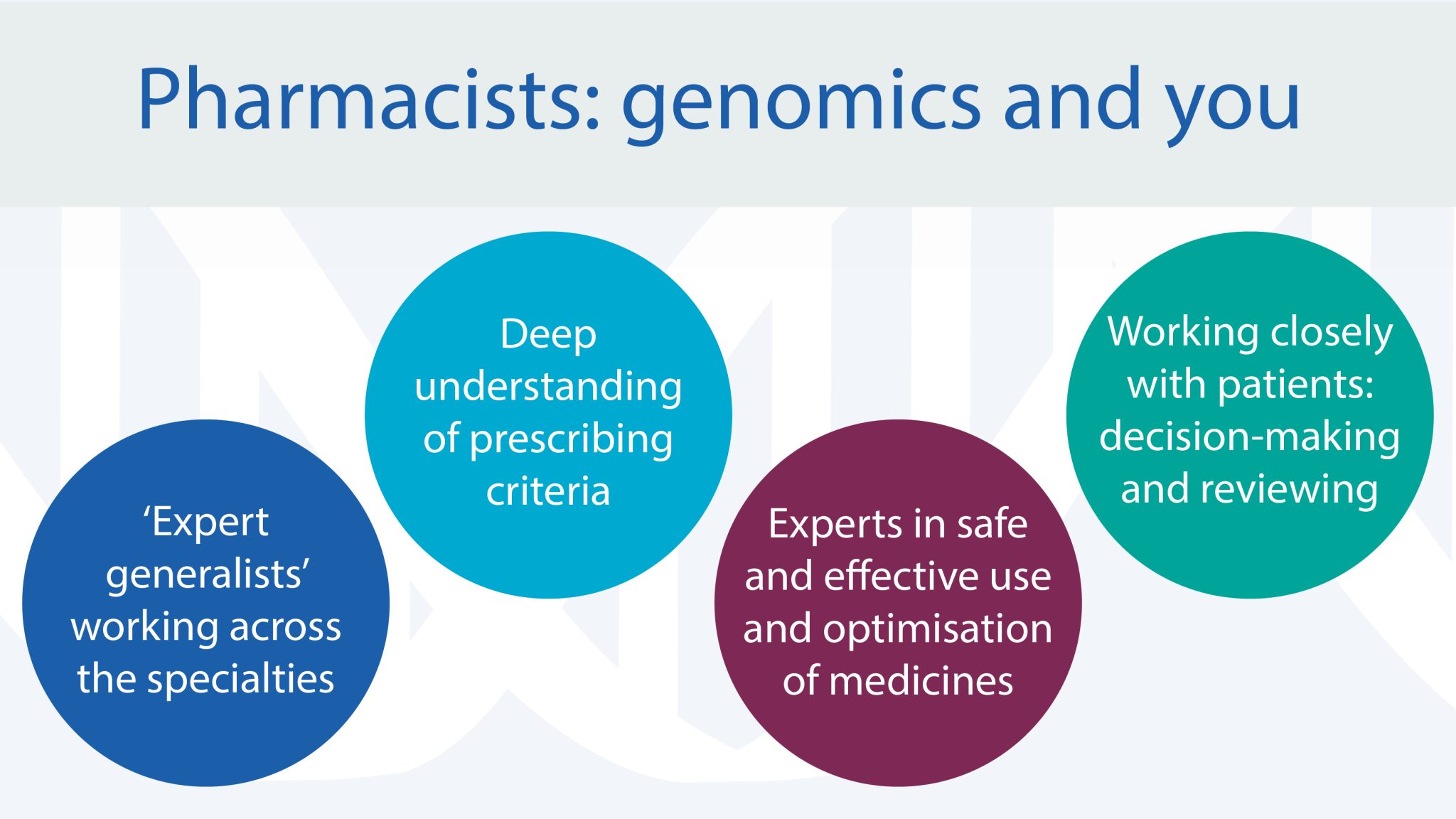 Pharmacists and pharmacy technicians are in a unique position within the NHS to make a big impact. As experts in the safe and effective use of medicine, you are best placed to learn about and understand the many factors, including genomics, that influence an individual’s response to drugs and apply this to better patient care.