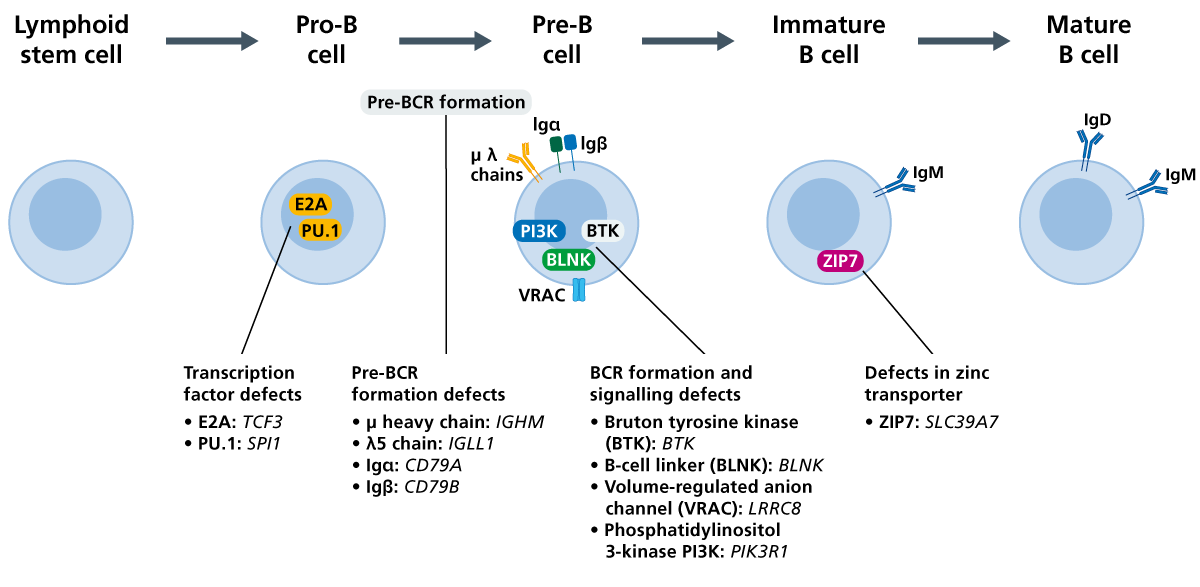 X-linked agammaglobulinaemia is a primary B-cell immunodeficiency characterised by susceptibility to infections, low/absent serum immunoglobulins and low/absent B cells. It is caused by pathogenic genetic variants in the BTK gene, which codes for a critical tyrosine kinase in B-cell development.